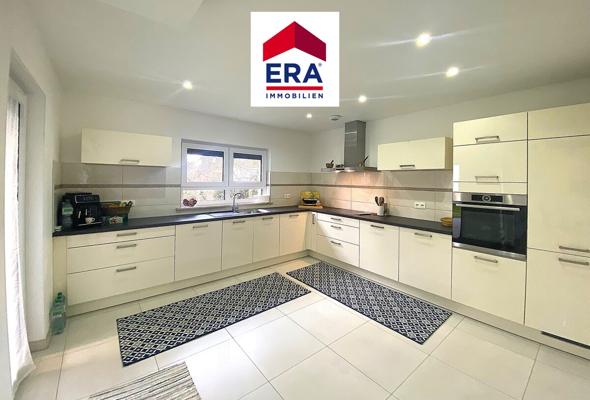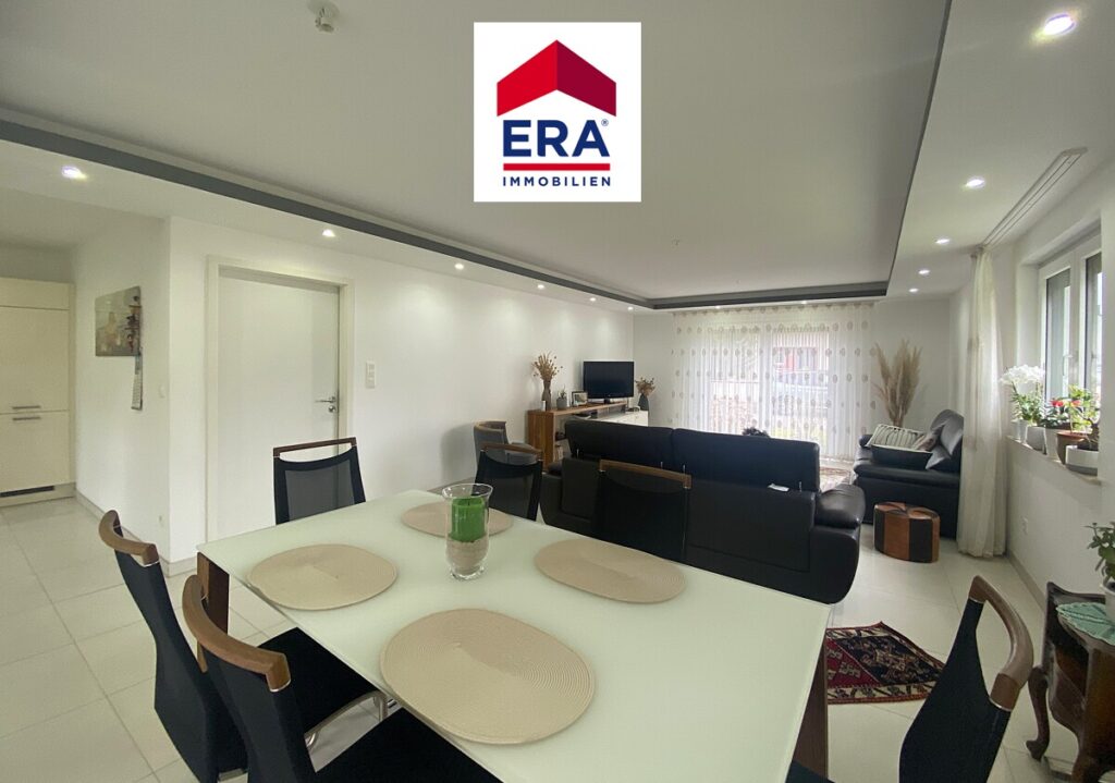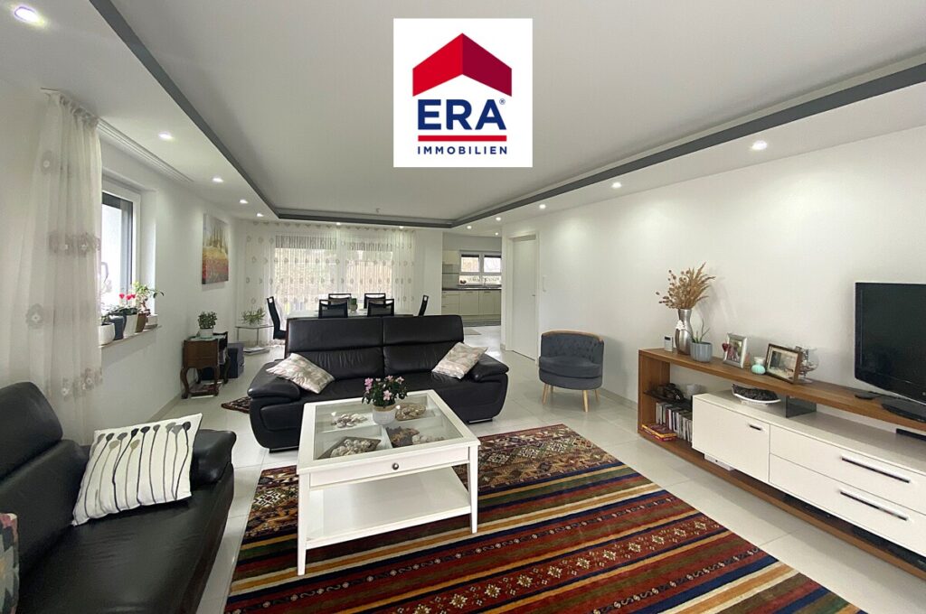 Über den Eingangsbereich mit großem Schiebetüren-Spiegelschrank und Gäste WC mit Waschbecken, erreichen Sie den lichtdurchfluteten Wohn-, Essbereich mit moderner Küche und Zugang zur Terrasse mit Garten.